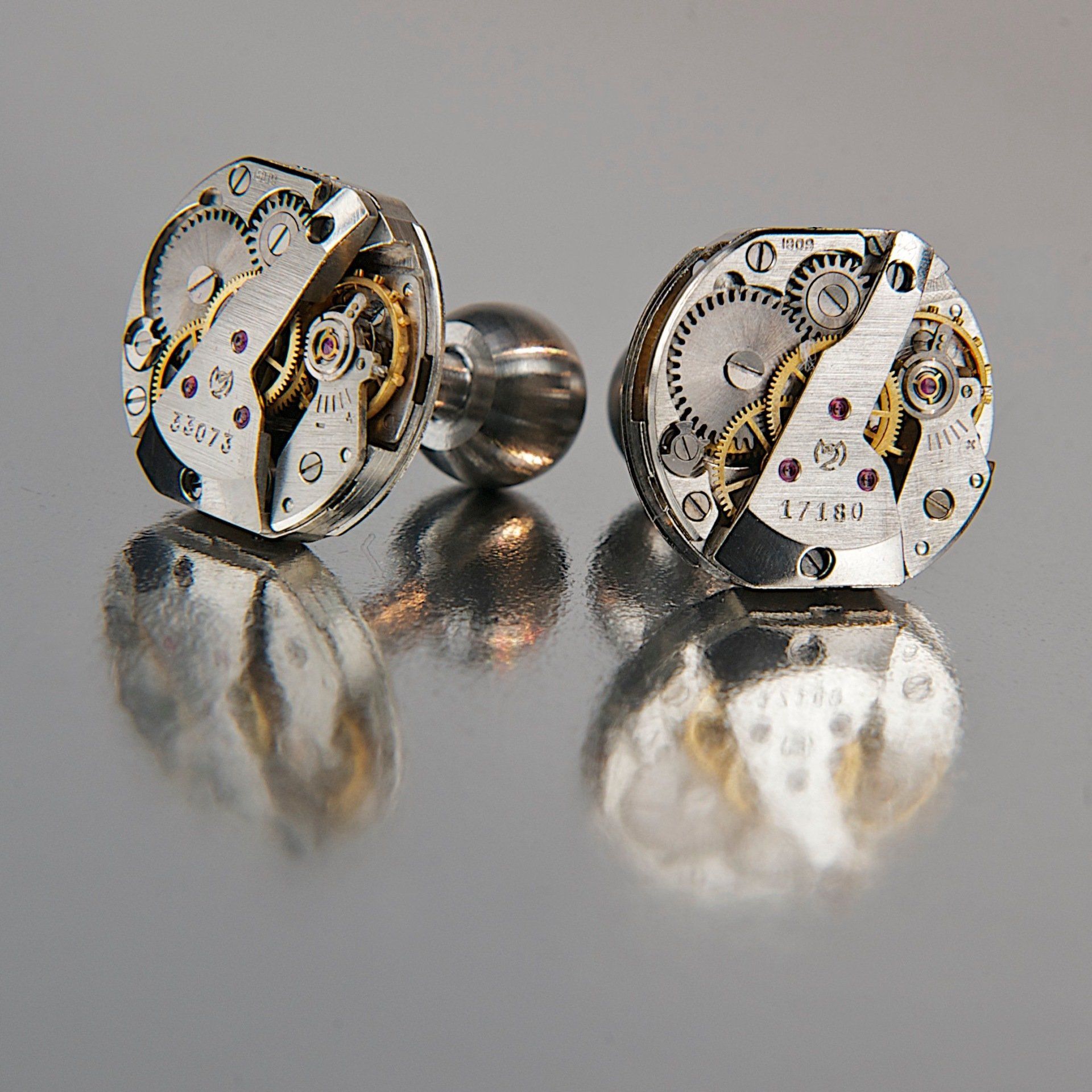 Die ungewöhnliche Form dieses Handaufzugswerks ist eine Mischung aus rechteckig, rund und oval. Dazu eine schräg über das Werk verlaufende Hauptbrücke, die dem Kaliber eine wunderbare Dreidimensionalität verleiht. Unter dieser Hauptbrücke arbeiten gut sichtbar das Stunden- und das Minutenrad, noch eine Etage tiefer ist die hübsche, goldfarbene Schraubenunruh zu sehen. Das Uhrwerk ist ein russischer Lizenz-Nachbau auf Basis des Schweizer Kalibers FHF 57-21 (Hersteller: Fabrique d’Horlogerie de Fontainemelon).