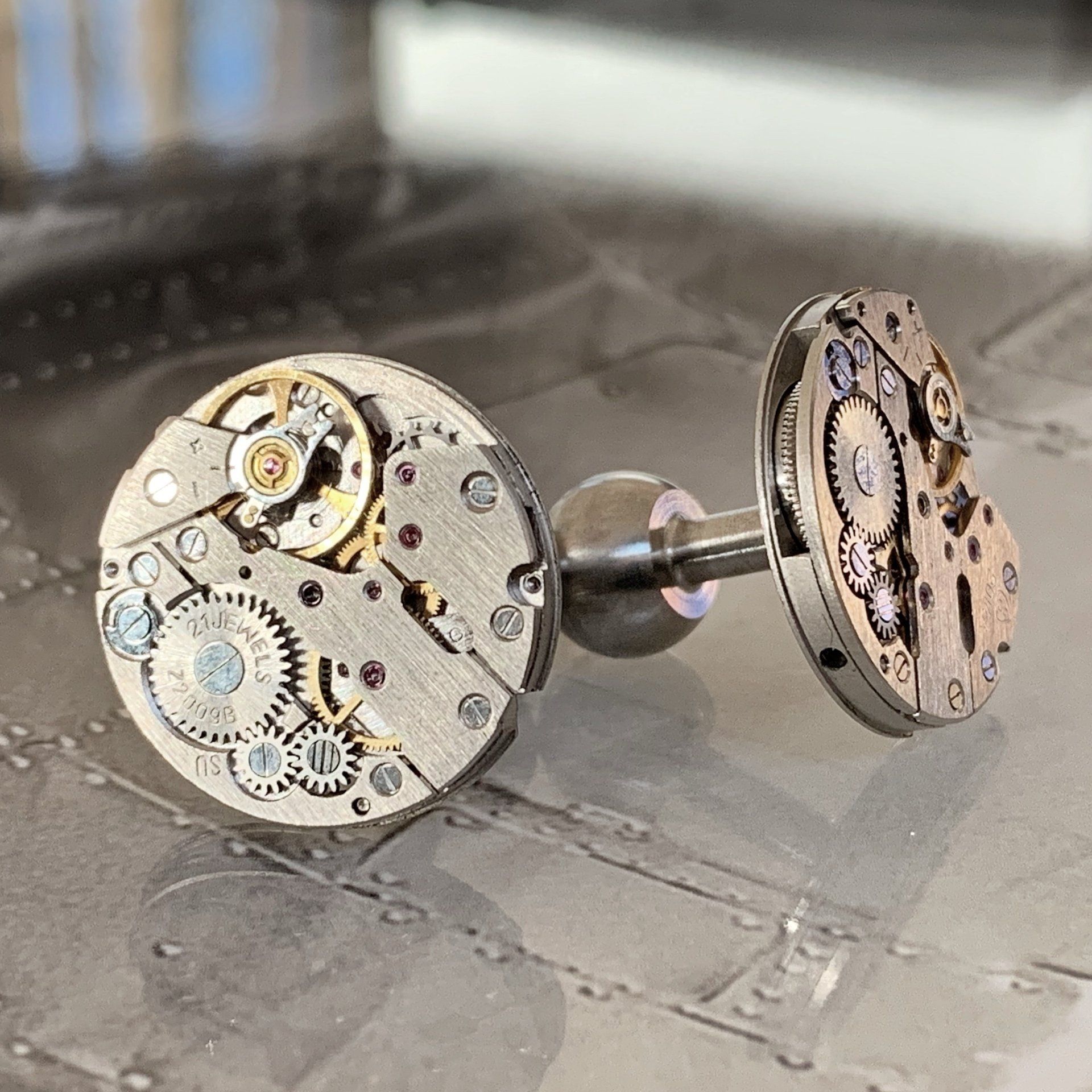 Manschettenknöpfe aus einem historischem Kaliber Zarja 2009B in cooler Machine Brushed Optik. Wir haben dieses Serie wegen ihres technischen Oberflächenfinishs nach der Stadt Corona in Kalifornien benannt, die für ihren einmaligen, innerstädtischen Automobil-Rundkurs bekannt ist.