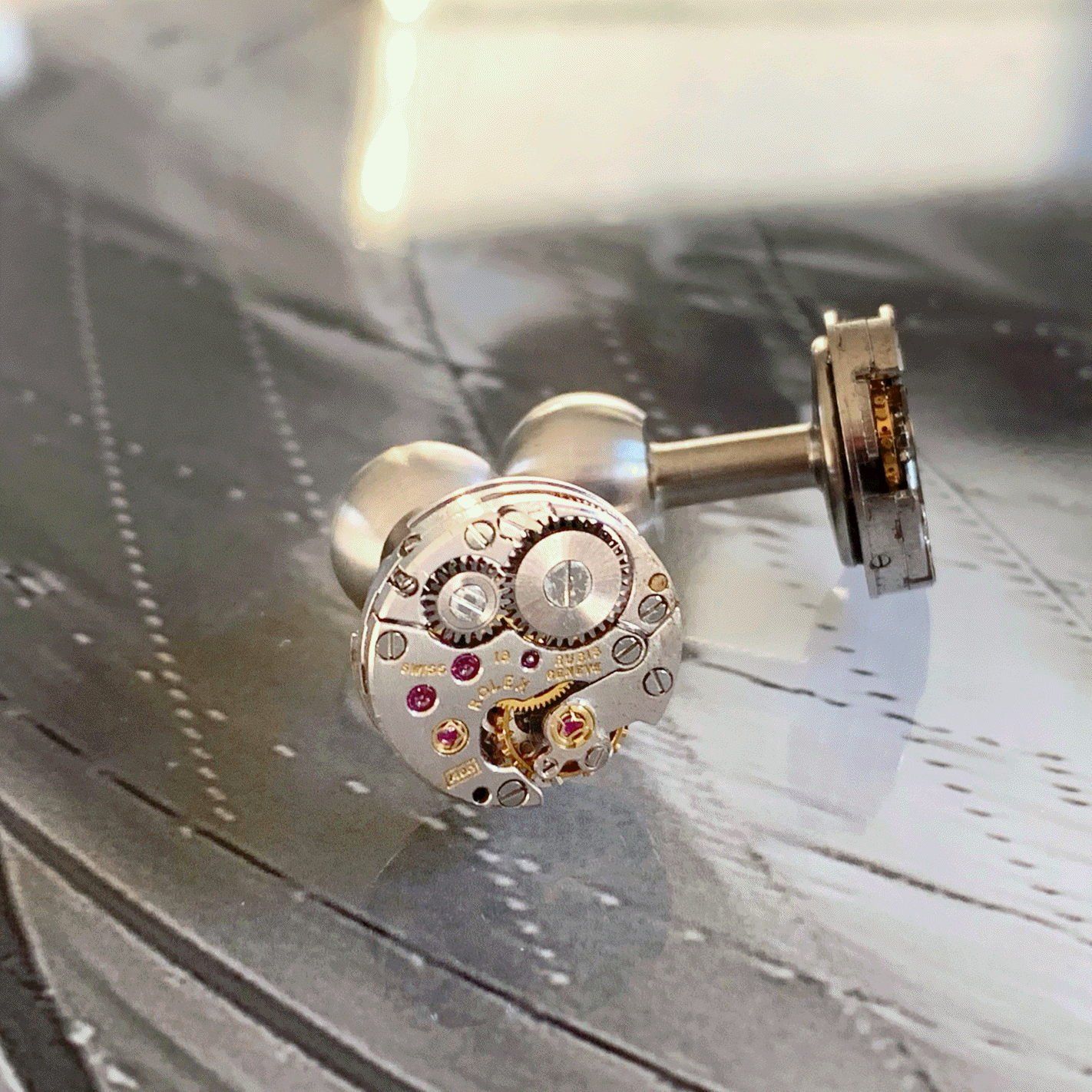 Exklusive Manschettenknöpfe mit dem feinen, historischen Rolex-Kaliber 1401. Das zierliche Handaufzugwerk mit zehn Rubinen stammt aus den 1950er-Jahren und wurde vornehmlich in wertvollen Damenuhren verbaut. Die gravierten Schriftzüge sind in feiner Goldschrift gehalten.