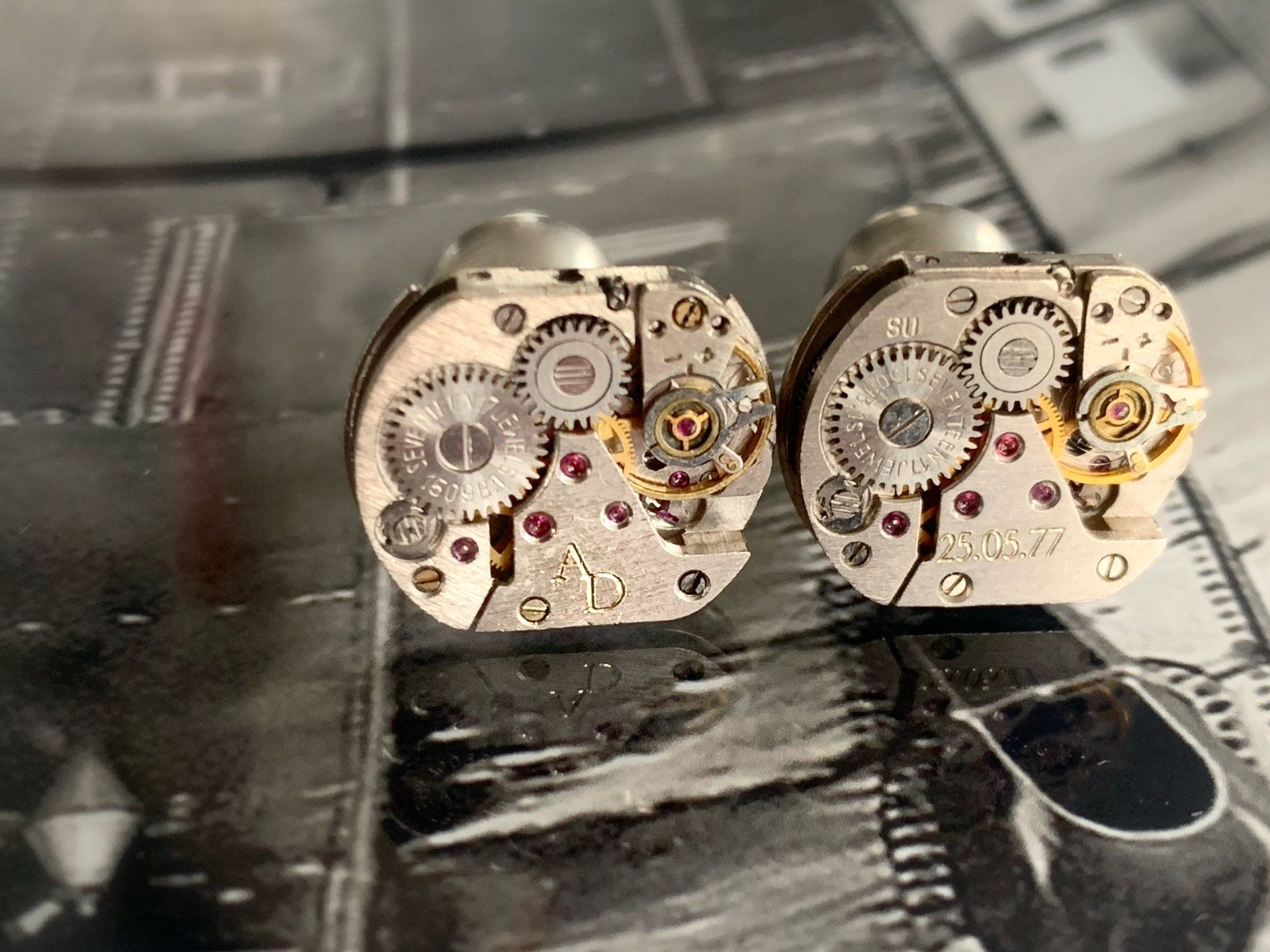 Zierliche Manschettenknöpfe mit Ihrer persönlichen Gravur. Hergestellt aus einem kissenförmigen Kaliber der Rohwerkefabrik FEF.