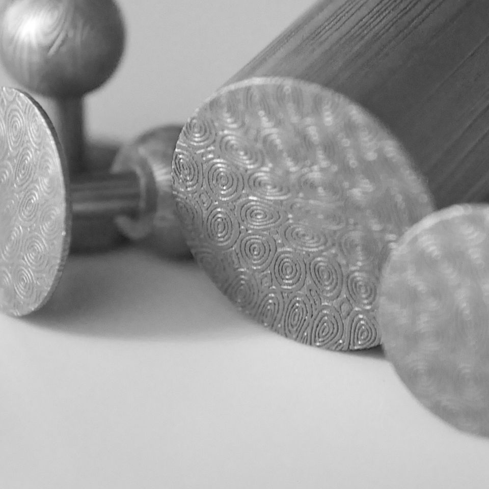 Unser Damaszenerstahl verbindet traditionelle Schmiedetechnik mit modernstem Sinterverfahren. Er besteht aus Messerstahl RWL und dem hochfesten Werkzeugstahl PMC27. Die beiden Sorten werden bei hohem Druck und hohen Temperaturen miteinander verschweißt. Jeder Manschettenknopf besteht aus insgesamt 120 Einzellagen Stahl. Die charakteristische Maserung gibt unserem Stahl den Beinamen ”Augen-Damast”. Nach dem Schweißen ist diese Maserung übrigens noch nicht zu erkennen. Erst nach dem Härten, Ätzen und Mattieren werden die Kontraste der einzelnen Stahllagen gut sichtbar. Die Oberfläche des Augen-Damasts ist extrem hart (60 HRC) und dauerhaft schön.